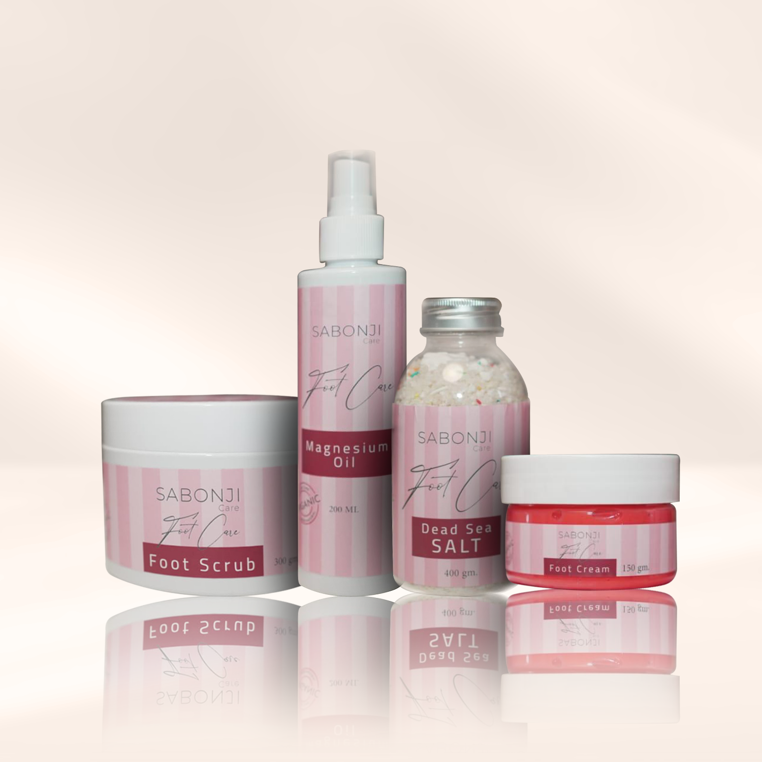 باكج متكامل مكوّن من: مرطب ومورد القدمين + مقشر ناعم + أملاح البحر الميت + زيت المغنيسيوم