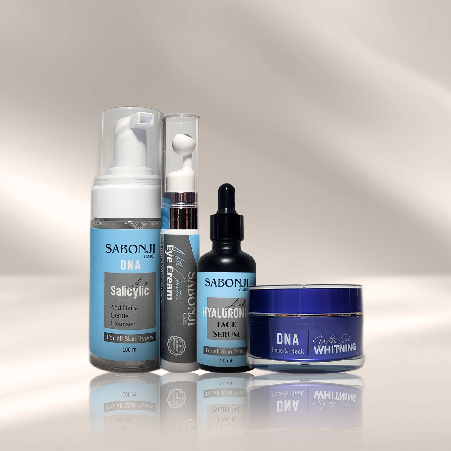 منظف لطيف بحمض الساليسيليك 2% + جل مرطب يعيد التوازن + سيروم هيالورونيك للترطيب العميق + وكريم عين بزيت اللوز وفيتامين C. باكج DNAللبشرة الجافة العين لترطيب يدوم ويحافظ على نعومة البشرة.